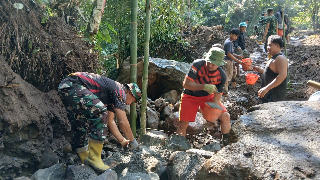 Meski bertepatan dengan hari libur, para personel TNI tetap bekerja keras. Dengan penuh dedikasi, mereka melanjutkan pembangunan pondasi jembatan yang menjadi salah satu sasaran utama program TMMD tahun ini. Jembatan tersebut dinilai sangat penting untuk memperlancar akses warga, khususnya dalam mendukung mobilitas hasil pertanian/perkebunan dan menghubungkan antar dusun.