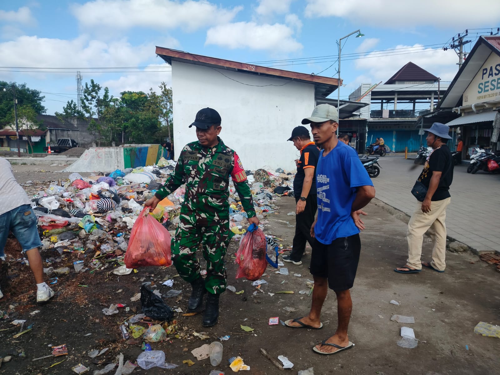 Lombok Barat, NTB – Semangat kebersamaan terlihat di Desa Sesela, Kecamatan Gunungsari, Kabupaten Lombok Barat, dimana Bintara Pembina Desa (Babinsa) Sesela, Komando Rayon Militer (Koramil) 1606-07/Gunungsari Sertu Sopian Hadi, bersama Kepala Desa Taufik, S.Pd., perangkat desa, dan warga setempat melaksanakan gotong royong membersihkan sampah di Tempat Pembuangan Sementara (TPS) Desa Sesela, Sabtu (11/10/2025).