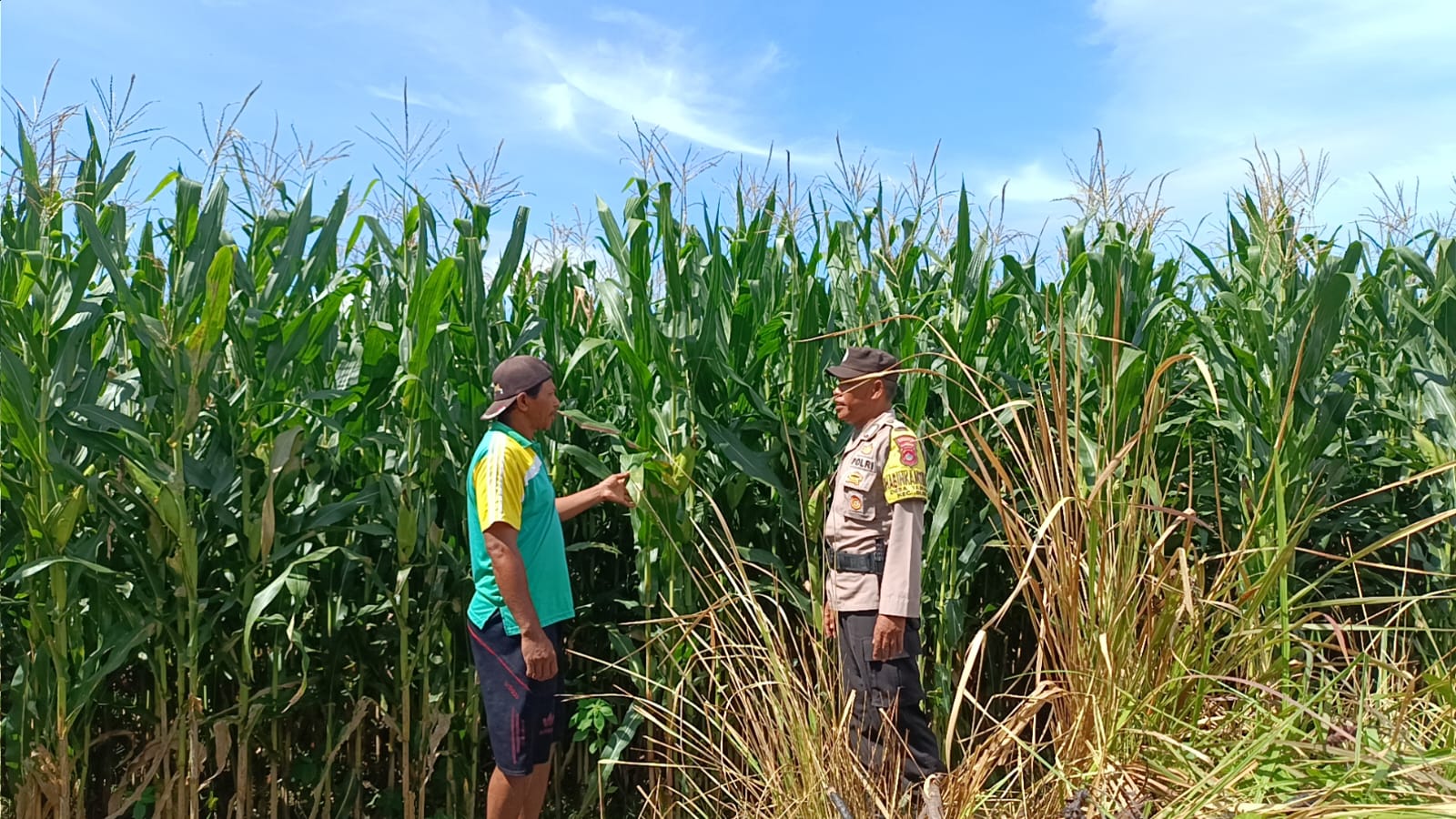 Bhabinkamtibmas melakukan sambang sambil memantau kondisi tanaman jagung yang saat ini baru berumur 3 bulan. Pemantauan ini bertujuan memastikan pertumbuhan tanaman berjalan baik dan terhindar dari hama, sehingga potensi hasil panen yang maksimal dapat tercapai. Selain pemantauan, Bhabinkamtibmas juga berinteraksi dengan petani, memberikan semangat serta imbauan agar selalu menjaga keamanan lahan pertanian.