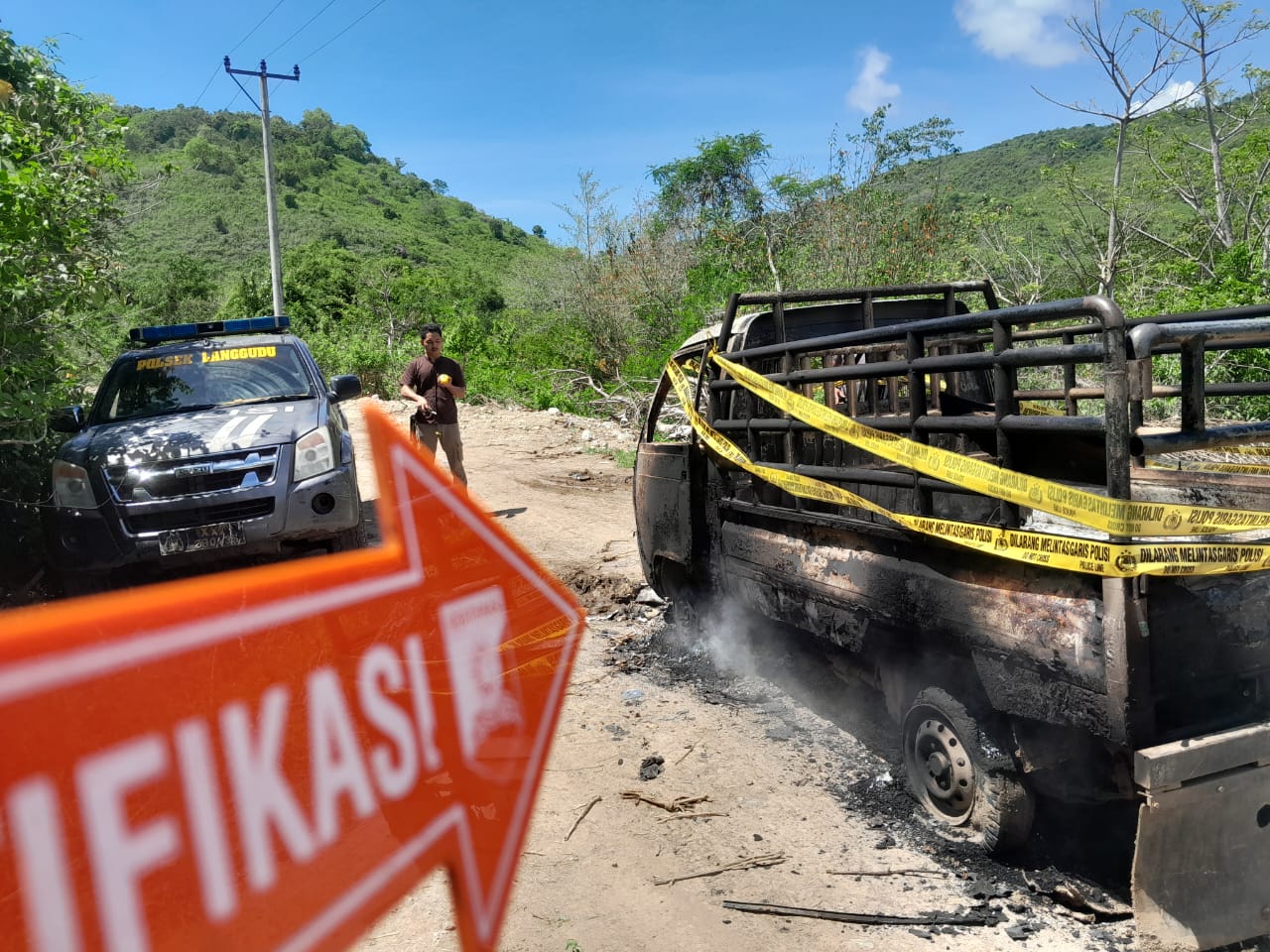 Diduga untuk Aksi Pencurian Ternak, Satu Unit Mobil Pickup Dibakar Warga di Desa Laju – Polsek Langgudu Datangi dan Amankan TKP