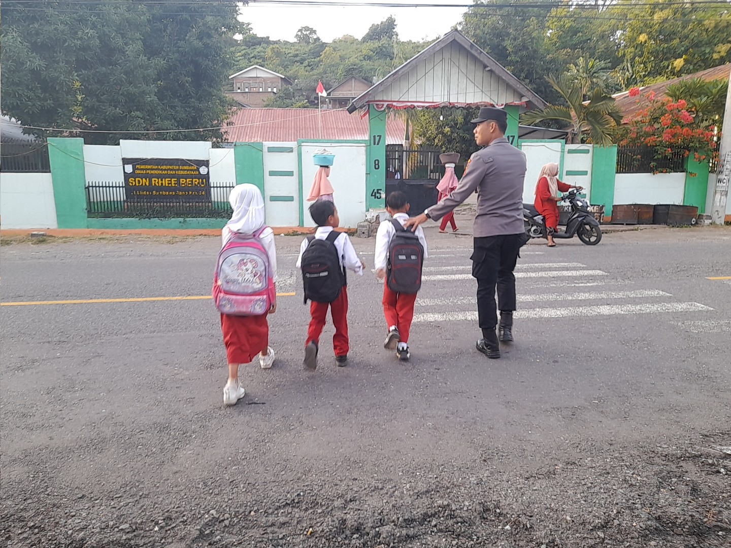 Jamin Keselamatan Anak Sekolah, Polsek Rhee Gelar Rawan Pagi di Jalur Lintas Sumbawa-Tano