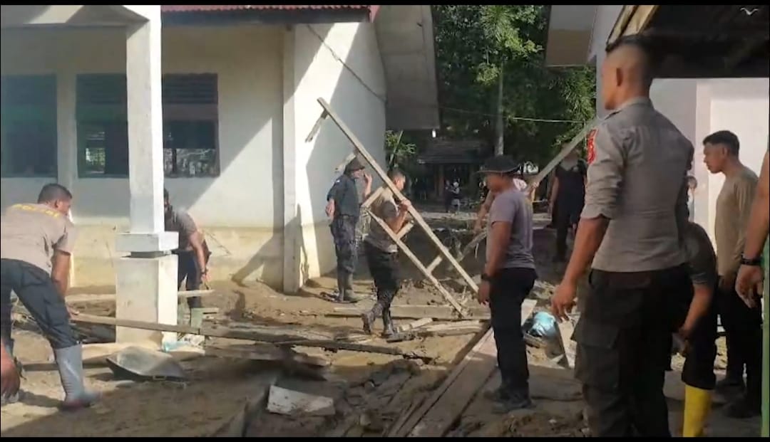 Sekolah tersebut merupakan salah satu fasilitas pendidikan yang terdampak banjir akibat tingginya curah hujan dalam beberapa waktu terakhir. Pasca surutnya air, sisa lumpur dan material banjir masih mengendap di sejumlah titik lingkungan sekolah sehingga membutuhkan penanganan cepat agar aktivitas belajar mengajar dapat kembali berjalan normal.