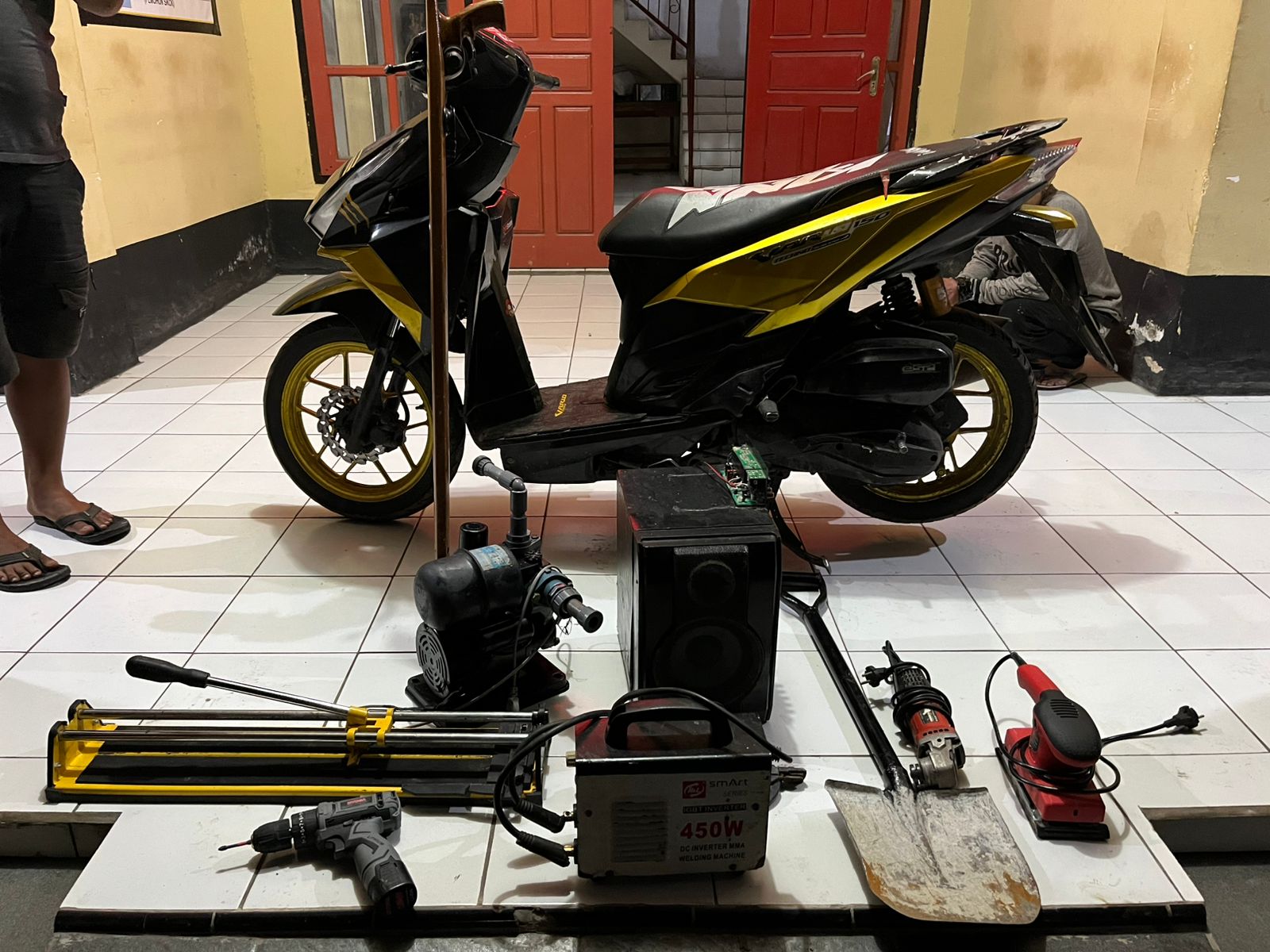 Dari tangan pelaku dan para penadah, polisi berhasil mengamankan beberapa barang bukti seperti 1 unit sepeda motor Honda Vario tanpa nopol, mesin las, mesin amplas, mesin gerinda, mesin air, sound system, speargun, alat pemotong keramik, bor listrik, serta sebuah skop.
