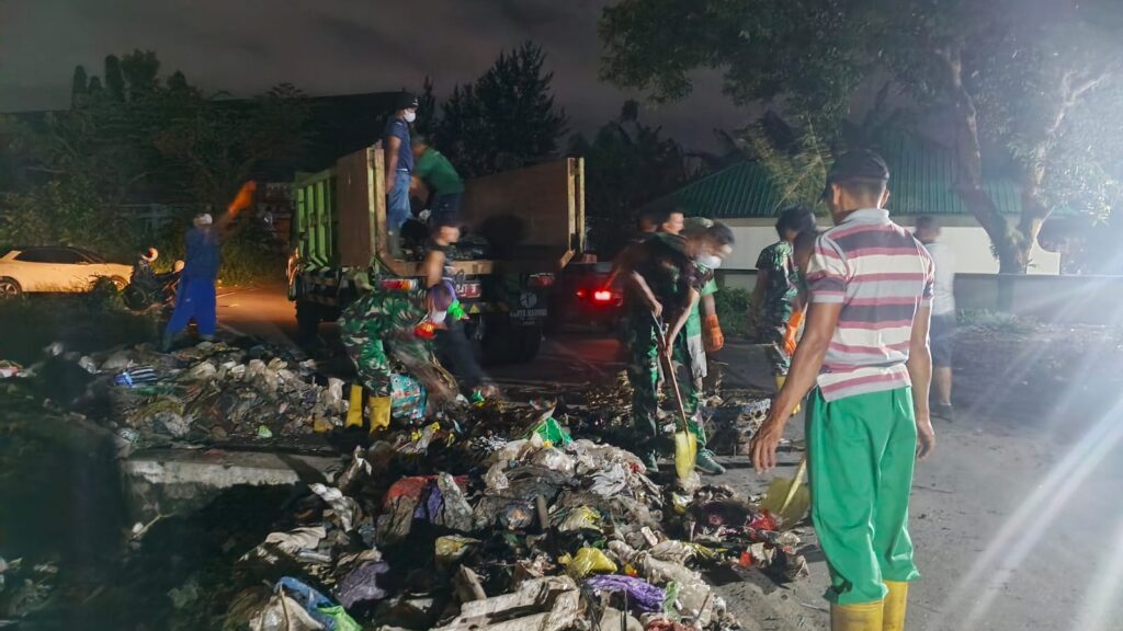 Lombok Barat, NTB – Semangat menjaga kebersihan lingkungan tidak mengenal waktu. Bahkan ketika malam telah larut usai ibadah tarawih, semangat pengabdian tetap menyala. Hal inilah yang ditunjukkan oleh Komandan Komando Rayon Militer (Koramil) 1606-07/Gunungsari, Kapten Inf Hamdan bersama anggotanya saat memimpin kegiatan gotong royong membersihkan sampah di area eks belakang Kantor Camat Gunungsari, Desa Gunungsari, Kecamatan Gunungsari, Lombok Barat, Kamis malam (5/3/2026).