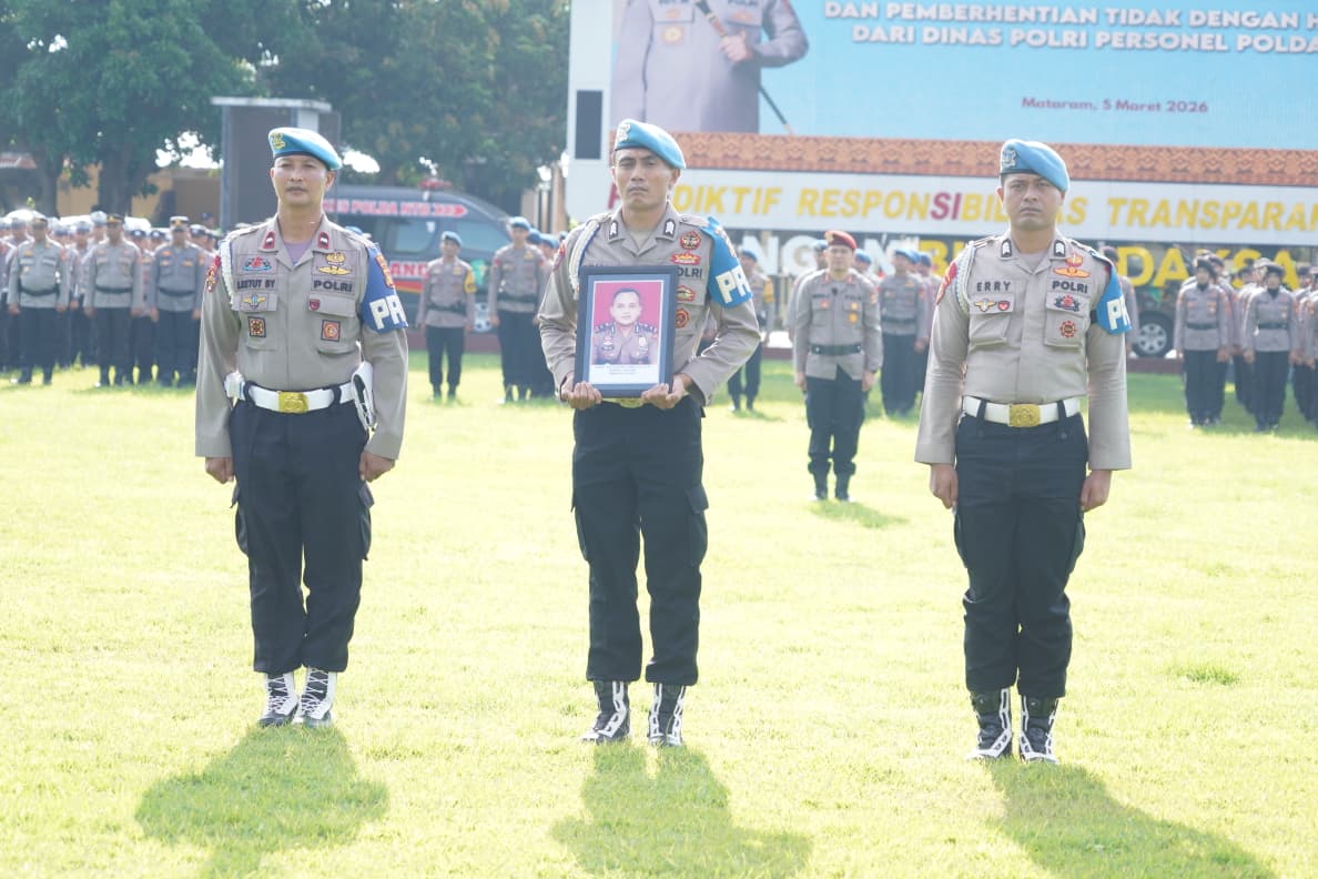 Mataram, NTB – Kapolda NTB Edy Murbowo memimpin upacara penyerahan penghargaan kepada personel berprestasi sekaligus pelaksanaan Pemberhentian Tidak Dengan Hormat (PTDH) terhadap anggota Polri yang melanggar kode etik. Upacara tersebut berlangsung di Lapangan Tribun Bhara Daksa Polda NTB, Kamis (05/03/2026).