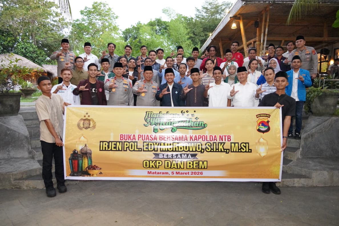 Mataram— Kapolda NTB Irjen Pol. Edy Murbowo, S.I.K., M.Si., Kamis (5/3/2026) malam, menghadiri buka puasa bersama organisasi kepemudaan NTB dan Badan Eksekutif Mahasiswa (BEM). Kegiatan berlangsung di Rumah Makan Dapoer Sasak mulai pukul 18.00 Wita hingga 19.20 Wita.