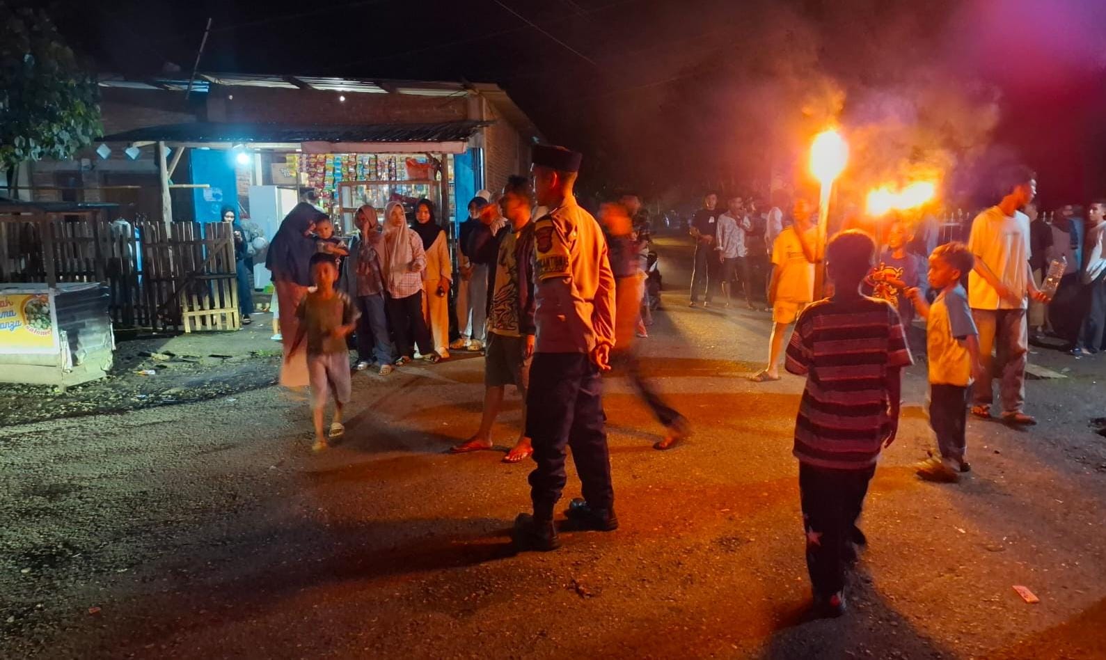 Warga Kecamatan Soromandi Kabupaten Bima turun kejalan menggelar pawai obor guna menyambut Idul Fitri 1447 H/2026 M.pada Jum,at 20.30. Wita Maret 2026, sekira Pukul 20.30 Wita.