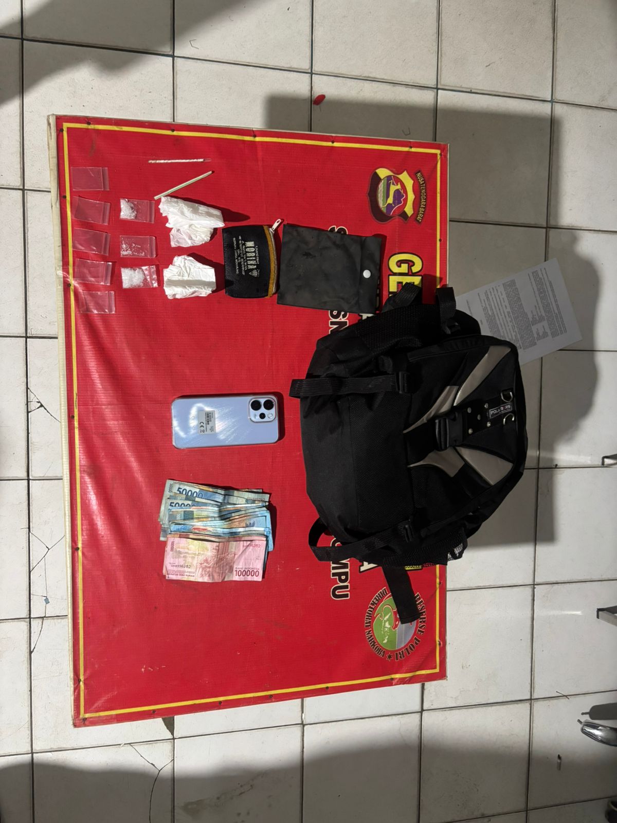 Dalam proses penggeledahan yang disaksikan oleh dua orang saksi umum, petugas menemukan sejumlah barang bukti berupa satu buah ransel warna hitam yang berisi kantong kecil berisi 3 klip kristal bening diduga sabu (dua di antaranya dibungkus tisu) dan 5 klip kosong, dua buah pipet yang telah dimodifikasi, satu unit handphone merek OPPO warna biru, serta uang tunai sejumlah Rp1.524.000. Total berat bruto narkotika jenis sabu yang diamankan mencapai 2,36 gram.