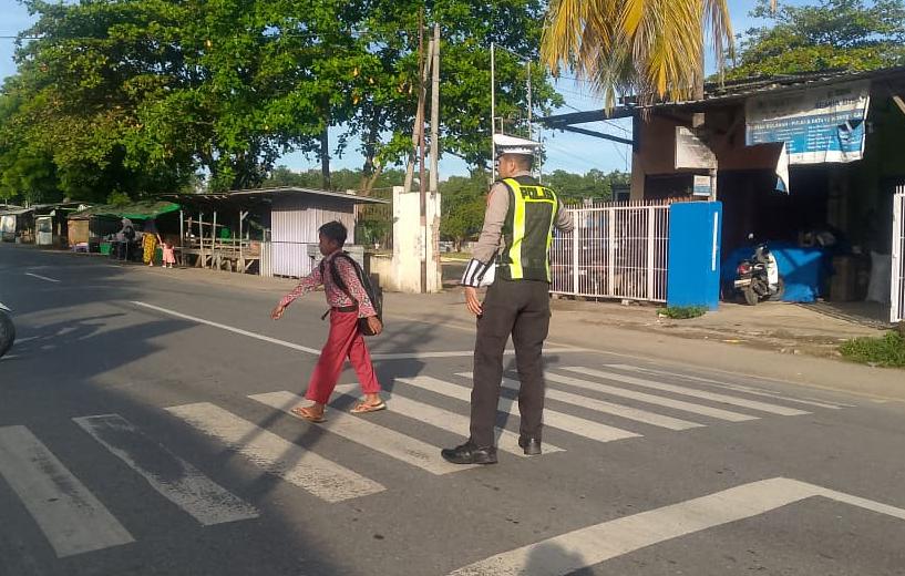 Petugas tidak saja melakukan penjagaan dan pengaturan arus lalulintas akan tetapi juga membantu menyebrangkan anak sekolah yang hendak masuk ke sekolah.
