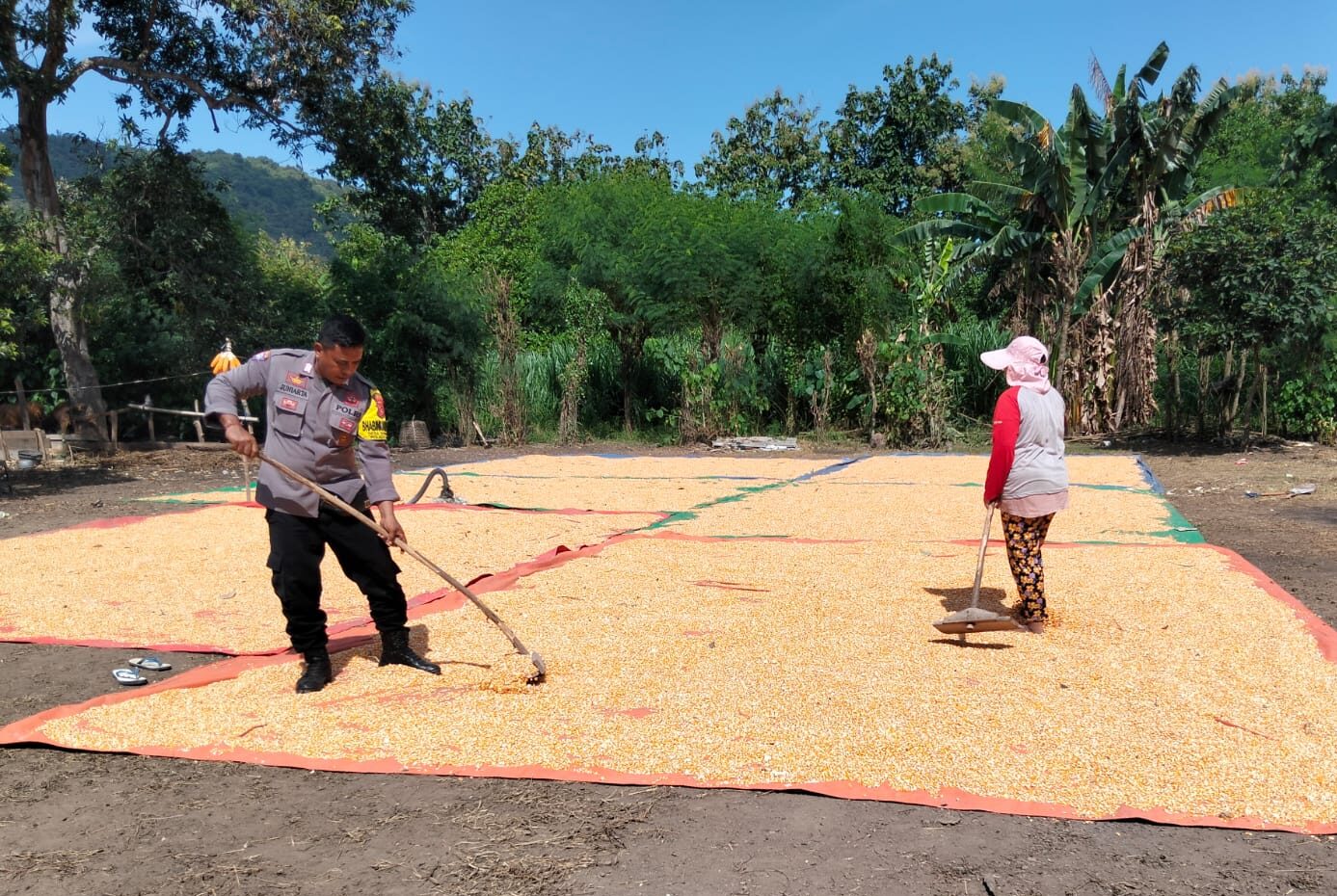 Dalam pelaksanaan kegiatan, Bhabinkamtibmas melakukan pemantauan terhadap proses penjemuran hasil panen jagung serta berdialog langsung dengan petani guna mengetahui kondisi di lapangan sekaligus memberikan motivasi.