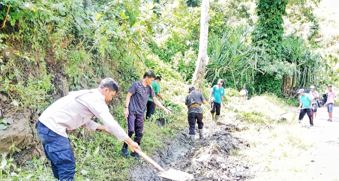 Melihat kondisi tersebut, Bhabinkamtibmas Bripka Jufrullah berinisiatif mengajak pemerintah desa dan warga untuk bergotong royong. Dengan peralatan seadanya, warga bersama-sama menyingkirkan timbunan tanah serta memangkas semak yang menutup badan jalan.
